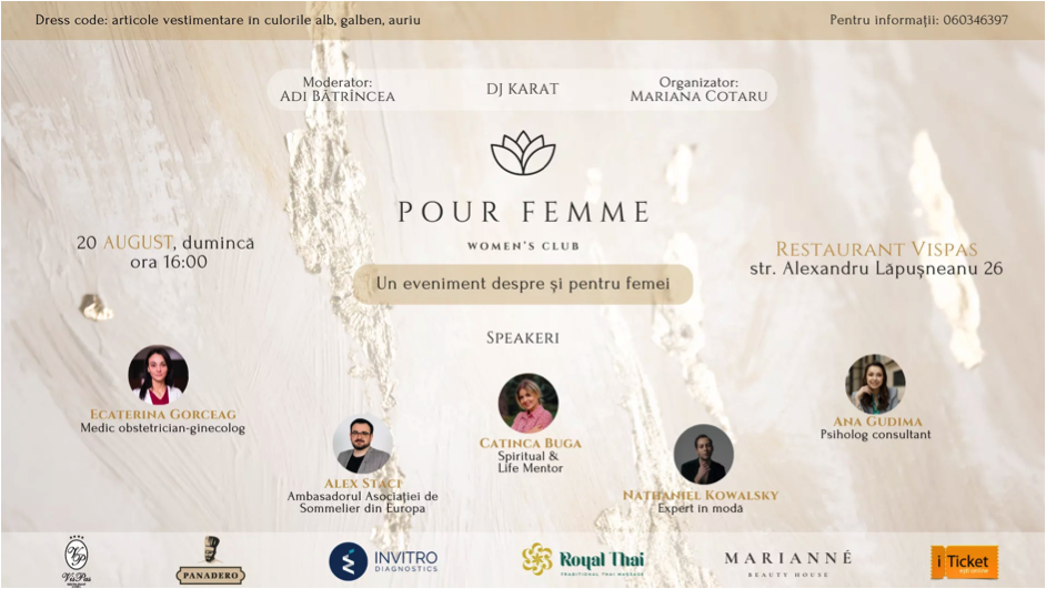 Un eveniment exclusiv creat pentru a celebra puterea și frumusețea femeilor. Ocazie unică de a te conecta cu alte femei inspirate și de a te bucura de o seară minunată într-un mediu plin de energie pozitivă.