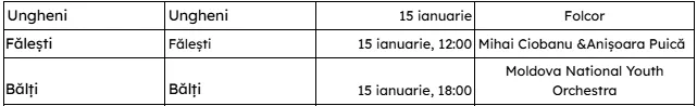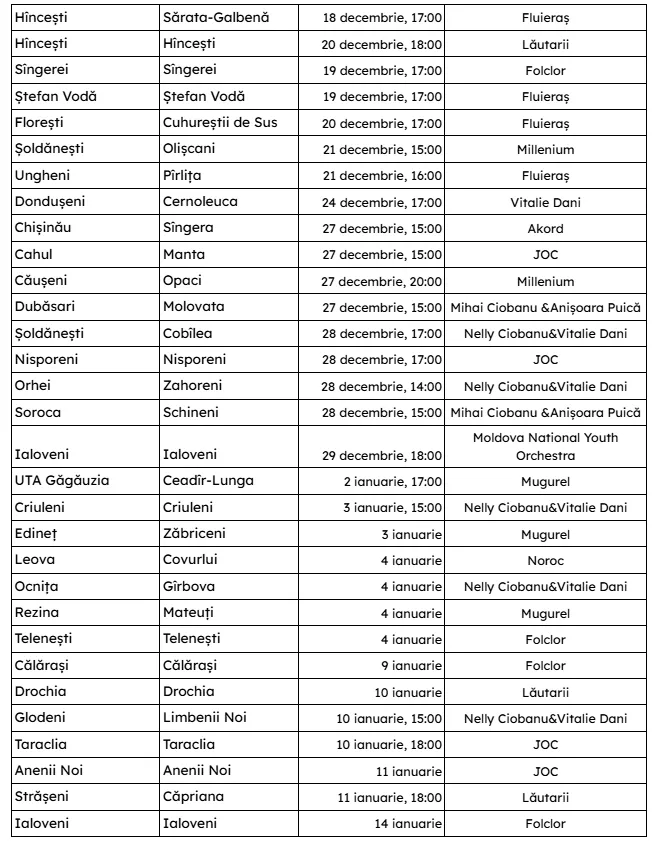 Primul concert al campaniei va avea loc pe 18 decembrie 2025, în localitatea Sărata-Galbenă, raionul Hîncești, marcând începutul unei serii de evenimente care vor aduce atmosfera Crăciunului mai aproape de fiecare comunitate din Moldova.