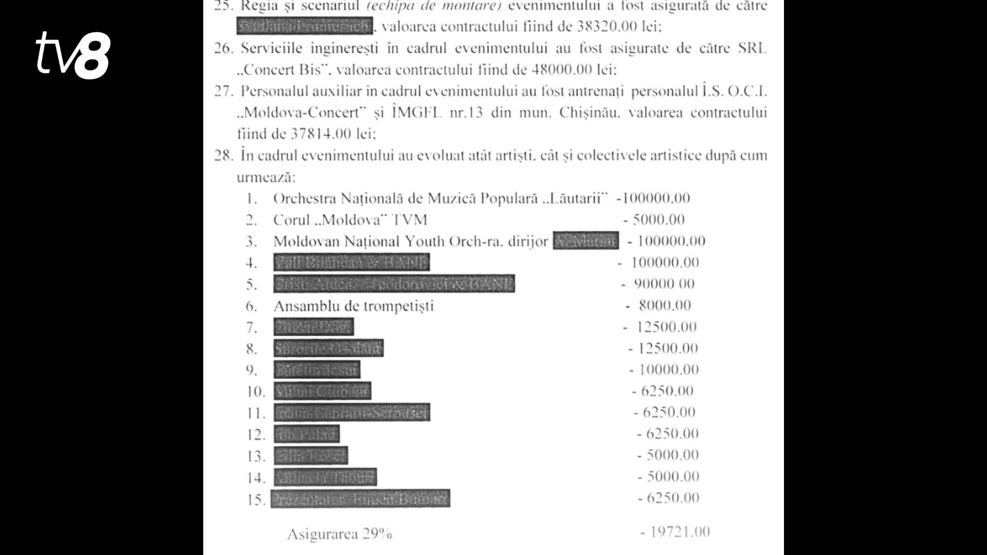 Orchestra Lăutarii - 100 000 lei, Corul ”Moldova” al TVM - 5000 lei, Moldovan Național Youth Orchestra, dirijor A. Marian (fratele deputatului Radu Marian) - 100 000 lei, Vali Boghean & band - 100 000 lei, Cristi Aldea-Teodorovici & band - 90 000 lei, Ansamblu de trompetiști - 8 000 lei, Eugen Doga - 12 500 lei, Surorile Osoianu - 12 500 lei, Cătălin Josan - 10 000 lei, Mihai Ciobanu - 6250 lei, Ioana Căpraru-Serbușca - 6250 lei, Ion Paladi - 6250 lei, Lilia Roșca - 5000 lei, Mihaela Tabura - 5000 lei, Prezentator - Eugen Butnaru - 6250 lei, Regia și scenariul - Svetlana Frumusachi - 38 320 lei. Asigurarea (29 %) - 19721 lei.