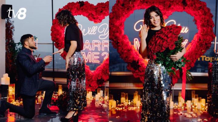 Iubitul ei, Valeriu Mircea a îngenuncheat și i-a oferit inelul, dar și un buchet imens de trandafiri.