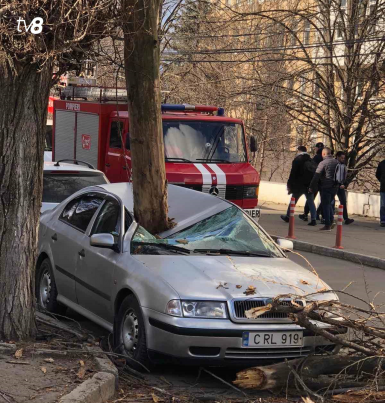 O creangă groasă a căzut peste un automobil parcat pe marginea străzii Constantin Vârnav, din sectorul Centru al Capitalei.