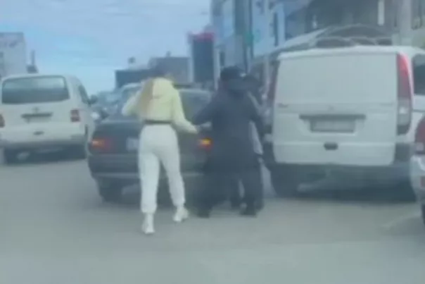 Câteva femei, care erau afară, încearcă să o calmeze pe șoferița furioasă și să o îndepărteze de vehicul.