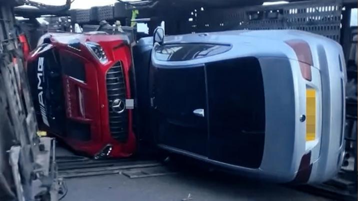 Pagube de milioane pe o șosea din Anglia, după ce un trailer auto care transporta mașini de lux s-a răsturnat. Potrivit presei locale, deși toate mașinile au suferit avarii serioase, șoferul a scăpat doar cu răni ușoare.