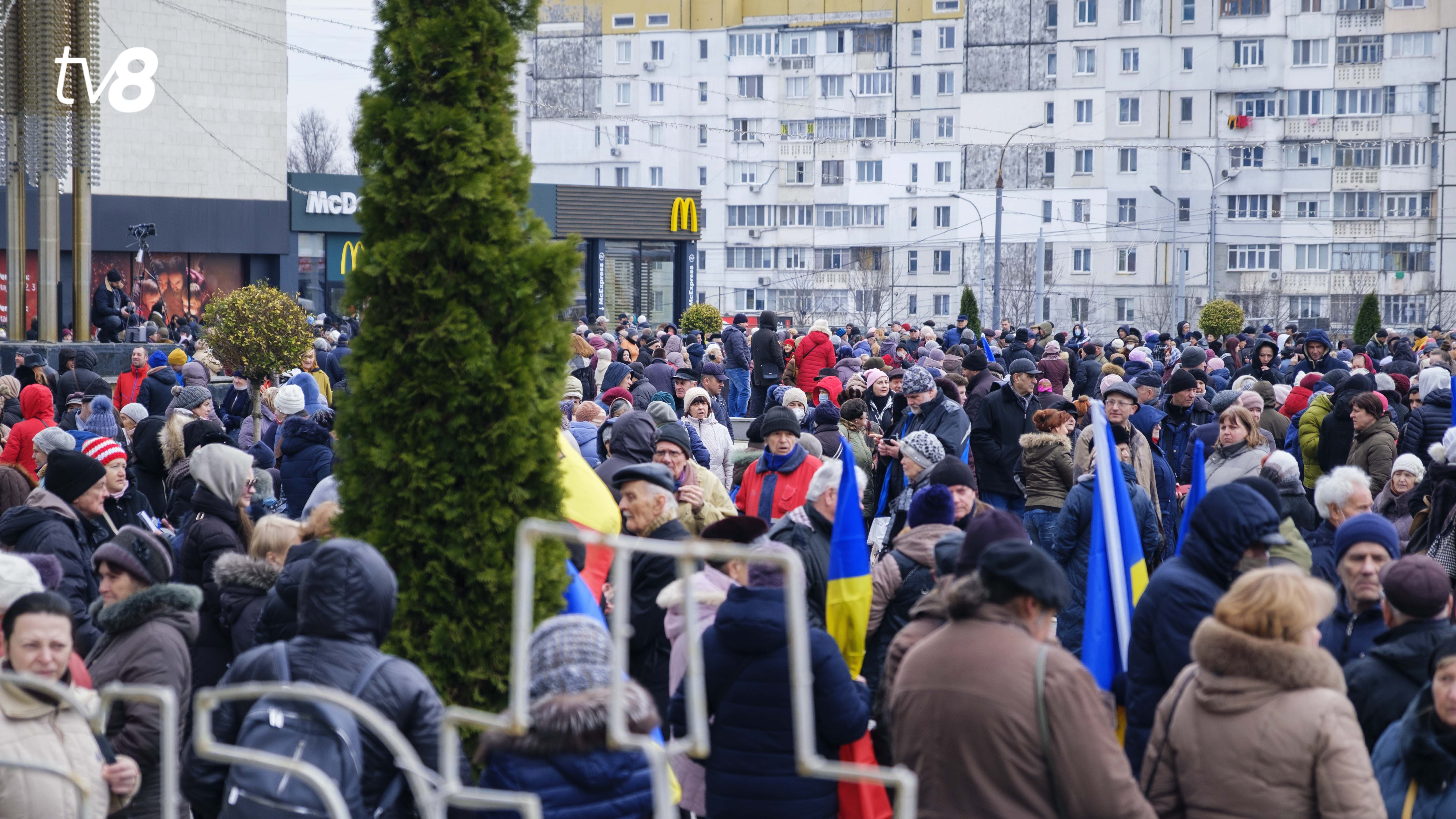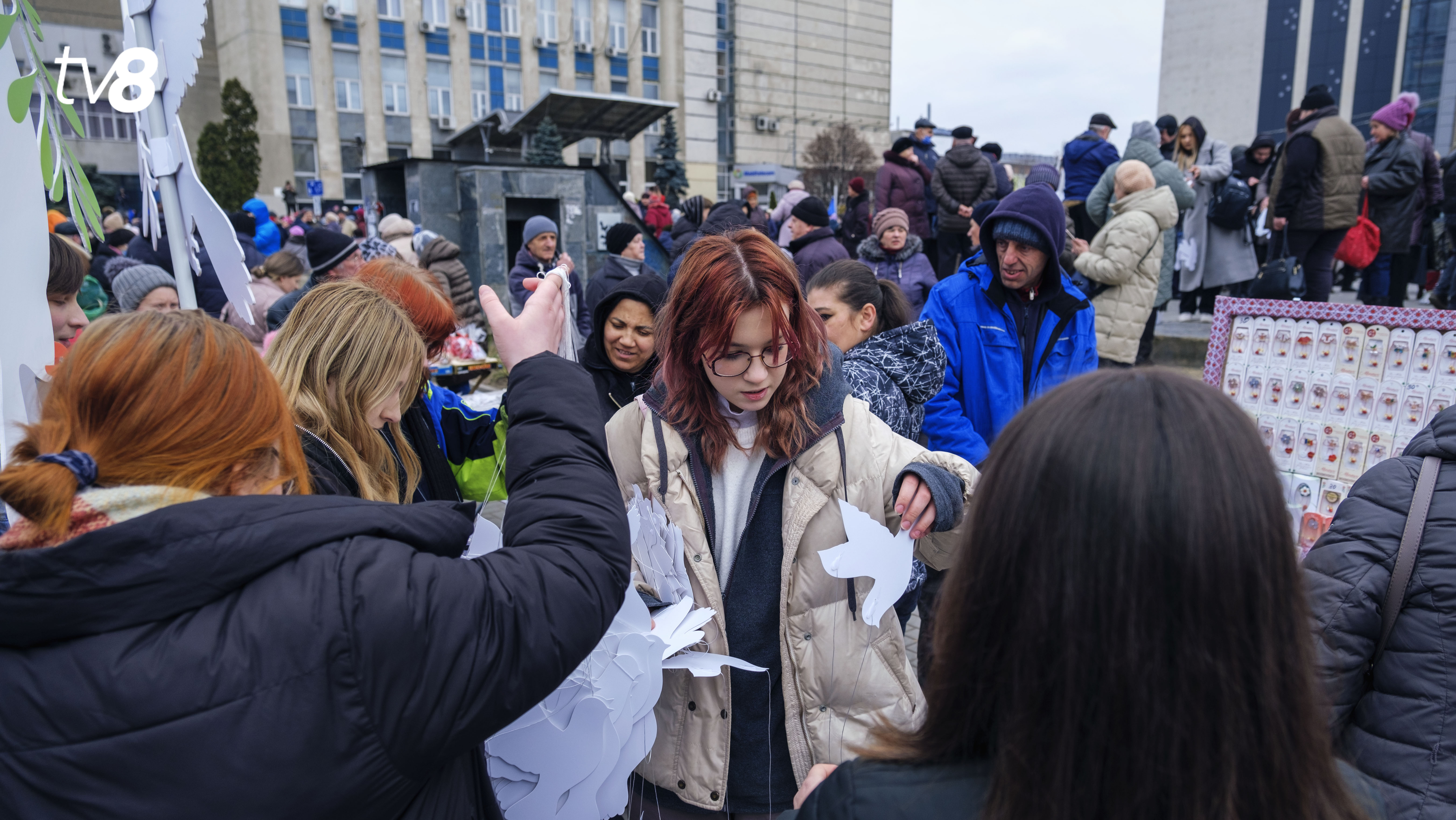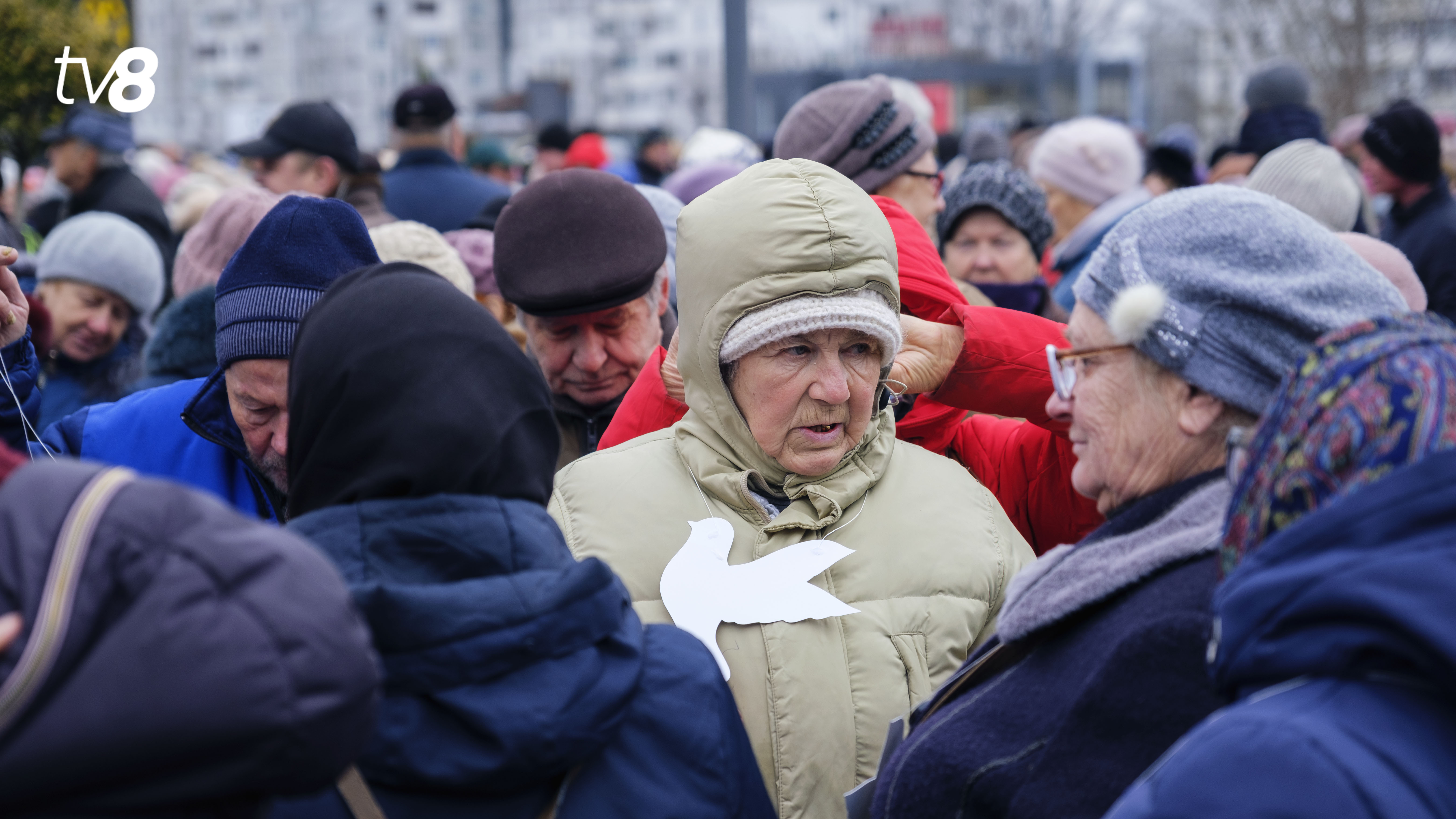 Oamenii care au reușit să ajungă la Chișinău, la protestul organizat de mișcarea pentru popor, s-au adunat, în jurul orei 12:00, în scuarul de la magazinul UNIC. Organizatorii au împărțit oamenilor porumbei confecționați din hârtie.