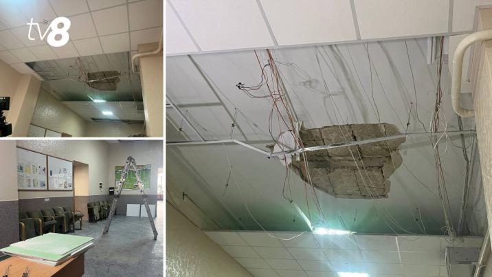 Din imagini se vede cum a căzut o porțiune de tencuială de pe tavan.