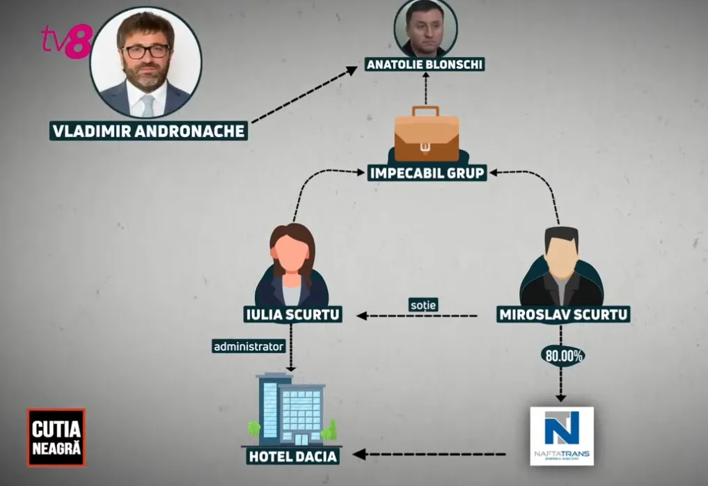 În lista SIS a persoanelor conectate la Andronachi a ajuns și un om de afaceri din domeniul petrolier, Miroslav Scurtu, împreună cu soția sa, Iulia Scurtu. Miroslav Scurtu este cunoscut ca acționar majoritar al companiei Naftatrans, un mare importator de benzină și motorină din R. Moldova. Iar soția sa administrează Hotelul Dacia din centrul Chișinăului, pe care Naftatrans l-a cumpărat în 2023.ai Soții Scurtu au ajuns în vizorul SIS pentru că sunt actuali proprietari ai companiei „Impecabil Grup”, conectată cândva la Vlad Andronachi.