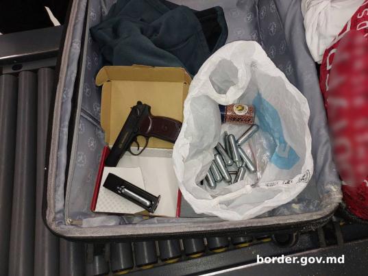 Pentru procedurile de control a pasagerilor de la ruta „Chișinău-Tel Aviv”, la ora 17:40 s-a prezentat tânărul de 22 de ani. În cadrul controlului de securitate, polițiștii de frontieră au observat în valiza persoanei un obiect suspect. La examinarea conținutului s-a stabilit că este un pistol pneumatic. De asemenea, au fost depistate două pachete cu zeci de bile din metal și 10 balonașe cu CO2.