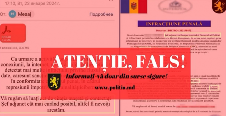 Inspectoratul General al Poliției atenționează cetățenii că, pe adresele electronice sunt distribuite în continuare mesaje cu conținut fals. Pentru a spori credibilitatea escrocheriei, infractorii cibernetici folosesc logourile instituțiilor publice și numele conducătorilor acestora.
