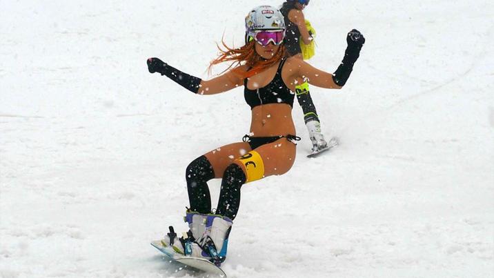 /VIDEO/ Atmosferă fierbinte pe pârtie: Participantele la un concurs au uitat de inhibiții și au schiat în costume de baie
