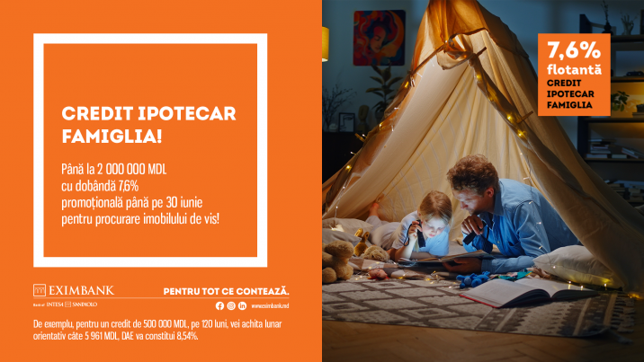 Trăiește momente magice alături de familia ta în propria locuință, cu credit ipotecar FAMIGLIA de la EXIMBANK. Acum, poți obține până la 2 000 000 MDL pentru procurarea imobilului de vis, beneficiind de o dobândă avantajoasă flotantă de 7,6% promotională până pe 30 iunie.