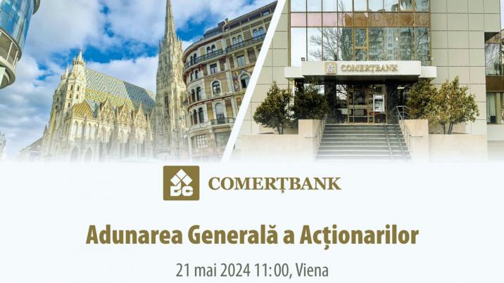 Prin prezentul Banca Comercială „COMERŢBANK”S.A., cu sediul în Republica Moldova, MD-2043, mun. Chişinău, str. Independenţei 1/1, vă informează că Consiliul B.C. "COMERŢBANK" S.A. a convocat Adunarea generală ordinară anuală a acţionarilor B.C. "COMERŢBANK" S.A., care se va ține cu prezența acționarilor, după cum urmează: