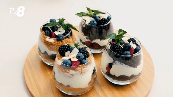 Adunăm toată masa din vas cu o spatulă, apoi cu ajutorul unui poș o aranjăm în pahare. După ce am pus primul strat de cremă, adăugăm 2 – 3 linguri de biscuiți, atât cât să acopere crema din pahar, apoi adăugăm fructele. Repetăm pașii anteriori încă o dată, până se umple paharul. La final decorăm desertul cu fulgi de migdale și mentă. Poftă mare!
