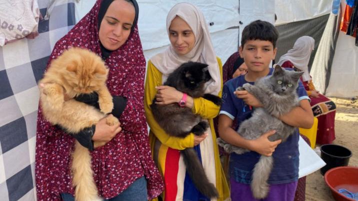 Pisicile aparțin familiei Harb, care și-a părăsit casa ce se afla într-un turn rezidențial din zona relativ bogată al-Zahra, din centrul Gazei, pentru a scăpa de atacurile aeriene israeliene, care au pus la pământ clădirea și o mare parte din vechiul lor cartier.