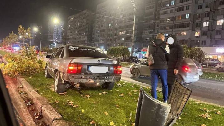 Peripeții seara pentru un șofer din Capitală. Mașina pe care o conducea s-a ciocnit cu un alt automobil, apoi a ajuns pe gazon și a doborât un copac.