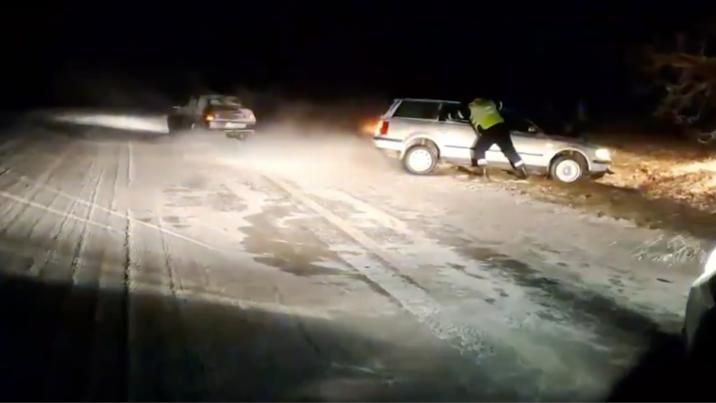 Din imagini se vede cum polițistul de patrulare împreună cu un bărbat împing mașina, care a ajuns în afara acostamentului.