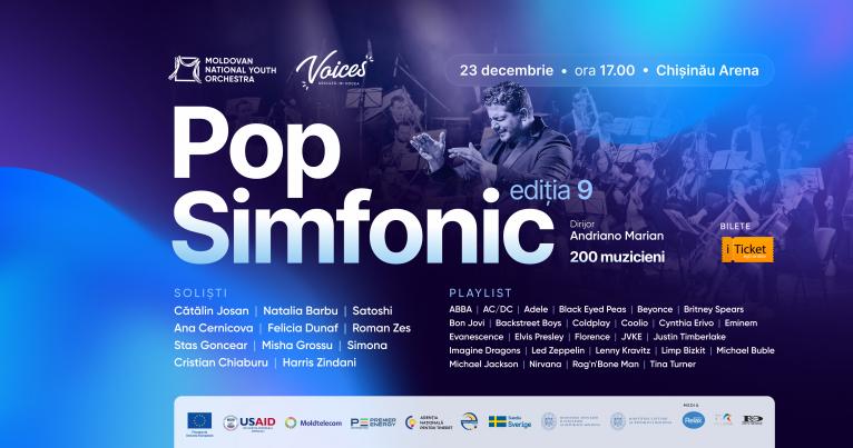 Pe 23 decembrie, la Arena Chișinău va avea loc cea de-a zecea ediție a concertului Pop Simfonic. Cu mândrie, Moldovan National Youth Orchestra în formulă extinsă, împreună cu corul „Voices Moldova” și cei mai talentați soliști, vor crea o seară memorabilă și electrizantă pe scena arenei din Chișinău.