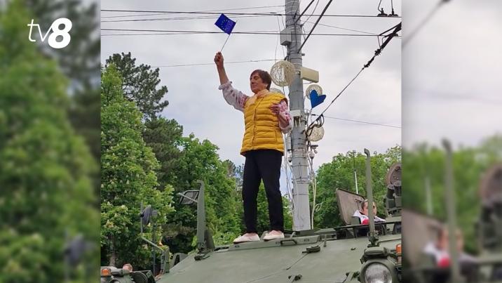 „Drumul corect e spre Europa”! Este mesajul transmis de o cetățeancă de pe o blindată din Capitală. Femeia i-a îndemnat astfel pe oameni să participe la referendumul privind integrarea europeană care va avea loc în octombrie, în aceeași zi cu alegerile prezidențiale. Cetățeanca a fluturat în mâini un drapel al UE, iar mulțimea a susținut-o.