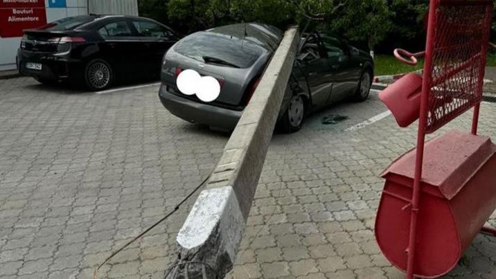 O mașină, parcată regulamentar într-o benzinărie, a fost făcută zob după ce un stâlp de beton a căzut peste ea. Din fericire, în momentul incidentului în automobil nu era nimeni.