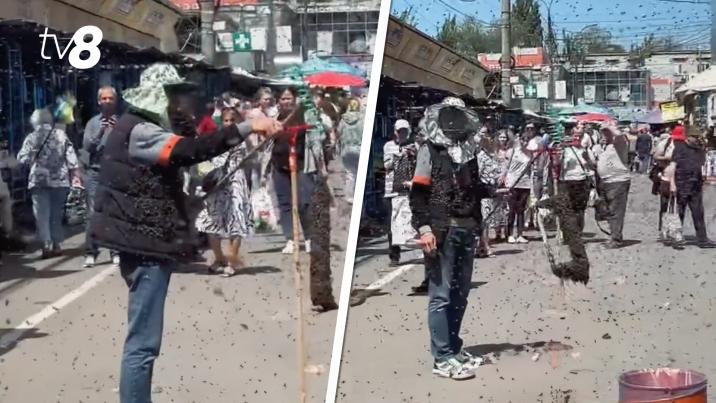Atac neobișnuit cu „ace”. Piața Centrală din Chișinău a fost ieri invadată de un roi de albine. Pe rețelele de socializare au apărut imagini în care un bărbat este practic acoperit de insecte, iar internauții au scris că ar fi vorba de un spectacol cu albine. Dar reprezentanții pieței spun că, de fapt, acesta încerca să le „îmblânzească”.