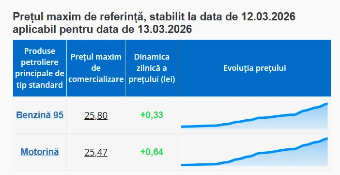 Prețul carburanților continuă să crească vertiginos în a doua săptămână a războiului din Orientul Mijlociu. Agenția Națională pentru Reglementare în Energetică (ANRE) anunță tarifele pentru ziua de vineri, 13 martie 2026. Astfel, benzina se va scumpi cu 33 de bani, iar motorina cu 64 de bani.
