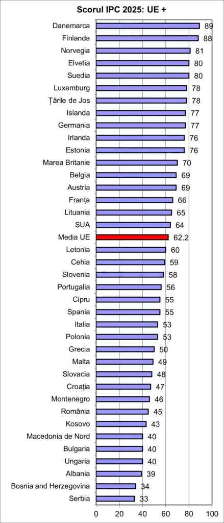 Pentru comparație, scorul IPC al țărilor din regiune este: Estonia – 76 puncte, Lituania – 65, Letonia – 60, Cehia – 59, Polonia – 53 și România – 45. Media IPC 2025 pentru statele Uniunii Europene este de 62,2 puncte (față de 62,3 în 2024), iar pentru țările Parteneriatului Estic – 40,8 puncte.