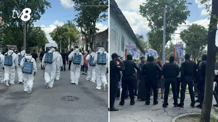 În zonă și-au făcut apariția și simpatizanți ai blocului „Victorie”, creat de fugarul Ilan Șor. Echipați cu măști, costume de protecție și „dezinfectant”, aceștia scandează împotriva LGBT+.