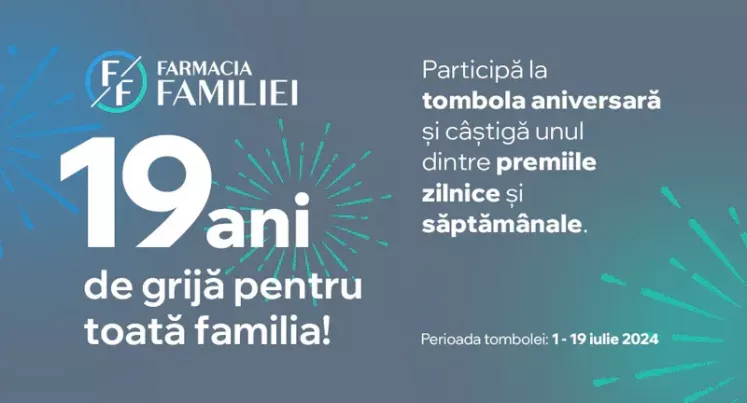 În luna iulie, Farmacia Familiei celebrează 19 ani de activitate! De-a lungul acestei perioade, am fost alături de tine și familia ta, oferind grijă, suport și soluții de sănătate. Cu ocazia aniversării, dorim să-ți răsplătim fidelitatea și încrederea pe care ni le-ai arătat.