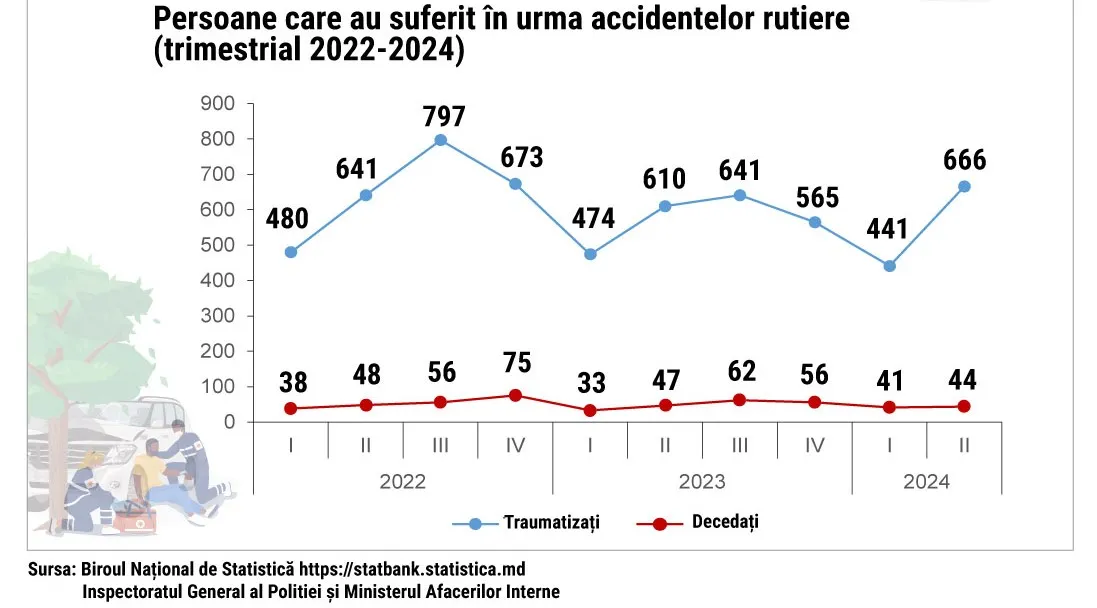 O creștere semnificativă a persoanelor traumatizate și decedate în urma accidentelor rutiere se atestă și în anul curent. Potrivit datelor din Sistemul Informațional Automatizat „Registrul accidentelor rutiere”, pe parcursul a șapte luni ale anului 2024, s-au înregistrat 1.105 de accidente în traficul rutier, comparativ cu 1.107, anul trecut. În rezultatul acestora, 111 persoane au decedat, comparativ cu 101 anul trecut, iar altele 1.334 au fost traumatizate comparativ cu 1.312, în 2023.