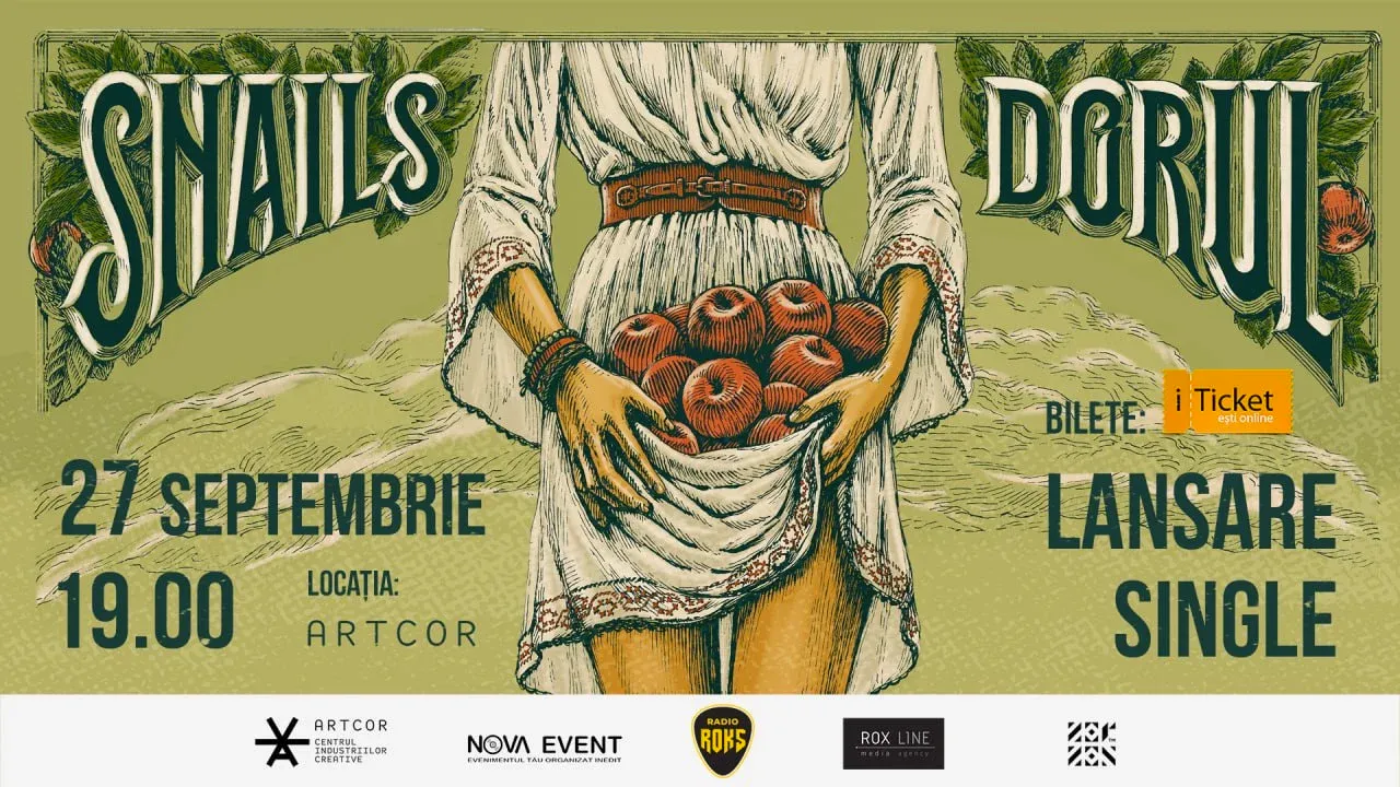 Dacă ești în căutarea unui concert care să te poarte pe valurile melancoliei și ale emoției autentice, trupa Snails îți propune DORUL. În această vineri, Artcor pune curtea, sală de concert și atmosfera de acasă. Nu rata această întâlnire cu arta!