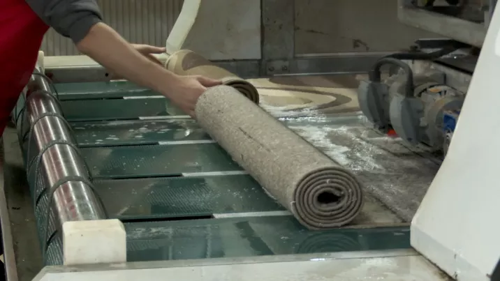 „Aici se petrece ultima treaptă de finisare a covorului, unde înlăturăm toate impuritățile care în procesul tehnologic mai rămân pe covor. Mai departe merge parfumarea, aspirarea și împachetarea”.