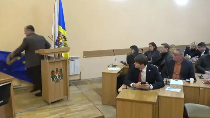 Drapelul Uniunii Europene a fost numit „cârpă” și aruncat pe jos. S-a întâmplat, astăzi, la ședința Consiliului Municipal Chișinău. După ce și-a terminat discursul de la tribună, în care a adus critici în adresa Uniunii Europene și a partidelor pro-europene de la Chișinău, consilierul PCRM, Adrian Domentiuc, a luat drapelul în mână și l-a aruncat la pământ. Acesta a fost ridicat de către un consilier PAS.