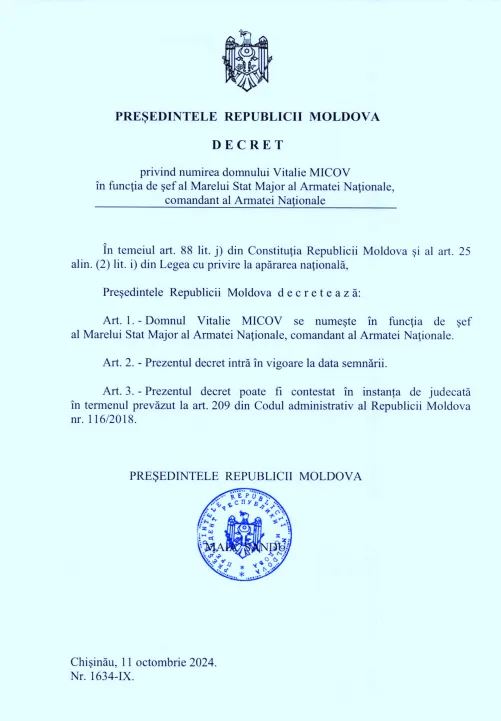 Colonelul Vitalie Micov este noul șef al Marelui Stat Major al Armatei Naționale. Numirea lui a fost aprobată printr-un decret semnat de președinta Maia Sandu.