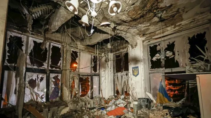 Preşedintele Volodimir Zelenski a denunţat atacul asupra clădirii Derzhprom (Industria de stat) din Harkov, unul dintre cele mai izbitoare exemple de arhitectură constructivistă din epoca sovietică.