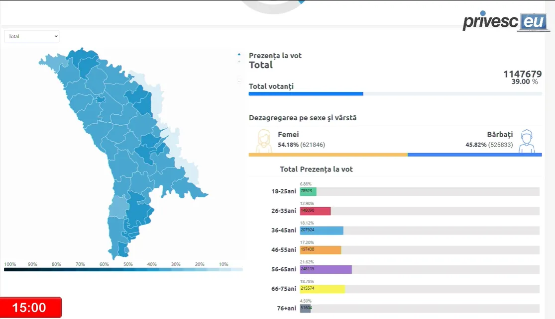 Femeile sunt cele mai active la vot. Cât despre categoria de vârstă, tinerii de 18-25 de ani sunt cei mai pasivi. În acest context, președinta CEC, Angelica Caraman, a îndemnat tinerii să participe la alegeri.
