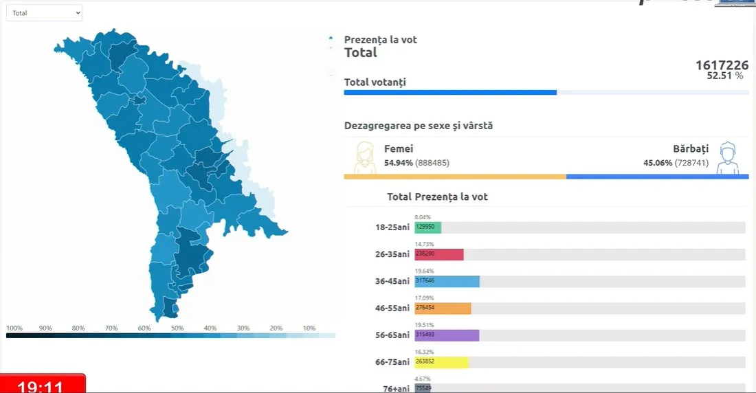 Între timp, moldovenii au trecut și peste pragul de participare din turul II al alegerilor prezidențiale din anul 2016. Asta după ce prezența de astăzi la vot a trecut de cifrele totale înregistrate în turul I.