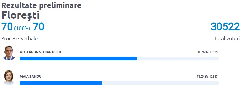 Alexandr Stoianoglo a fost preferatul alegătorilor din raionul Florești. Candidatul susținut de socialiști a convins 58,76% dintre alegătorii prezenți la urne. Iar candidata PAS, Maia Sandu, a adunat 41,24% din voturi.
