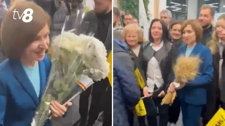 Atmosferă de sărbătoare la stafful candidatei PAS. Jurnalista TV8, Natalia Ghețu, a surprins momentul în care Maia Sandu este felicitată de colegi, alți cetățeni și inundată de flori.