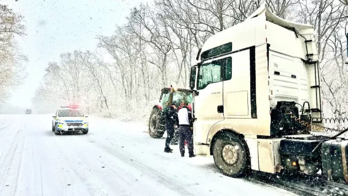 Polițiștii sunt prezenți pe trasee, inclusiv acordă ajutor șoferilor de camion blocați.