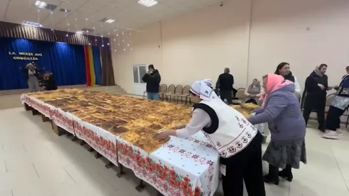 Zi importantă pentru 43 de gospodine din Coșcalia, care s-au adunat în centrul satului pentru a coace cea mai mare plăcintă din Moldova. Pentru asta, femeile au folosit 150 kg de făină, 150 kg de brânză, 300 de ouă și 60 de litri de ulei: