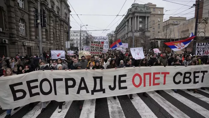 După 15 minute de reculegere în memoria victimelor accidentului de la Novi Sad, când acoperișul de beton al gării s-a prăbușit, omorând 14 persoane și rănind alte trei, studenții s-au îndreptat spre sediul Procurorului de Stat din Belgrad pentru a înmâna 1.000 de scrisori identice de protest.