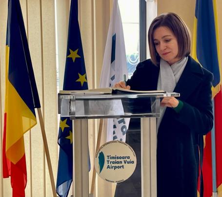 „Bun venit Preşedintelui Republicii Moldova, Maia Sandu!”, au notat reprezentanții Aeroportului Internaţional „Traian Vuia” din Timişoara, în postarea de pe Facebook, iar alături au postat trei fotografii.