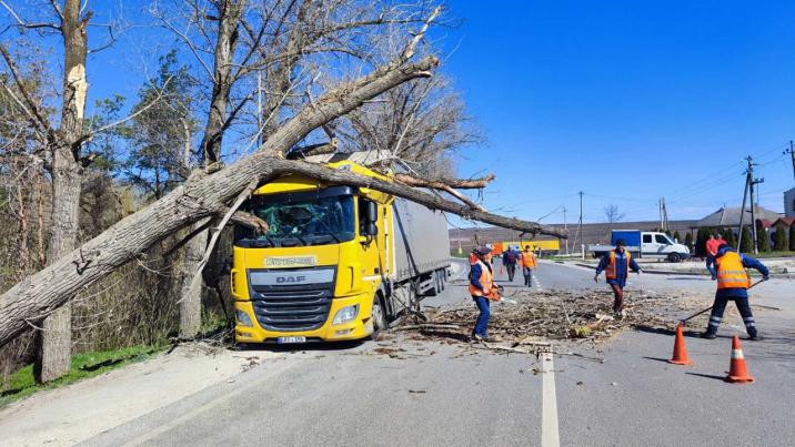 Din imaginile făcute publice de Administraţia de Stat a Drumurilor se vede un copac mare, doborât peste cabina unui camion. Incidentul a avut loc pe drumul R16 Bălți-Fălești-Sculeni-Ungheni, la intrare în localitatea Sculeni. Echipa ASD a intervenit pentru a remedia situația.