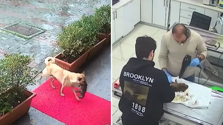 Imaginile surprinse de camerele de supraveghere de la clinică au ajuns virale. În video se vede cum într-o zi rece și ploioasă din Istanbul, când o cățelușă și-a dus puiul la clinică.