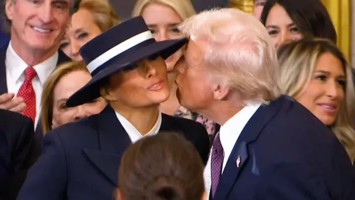 Când a intrat în sală, în ovaţiile celor prezenţi, Donald Trump s-a apropiat mai întâi de soţia sa pentru a o săruta pe obraz, dar s-a lovit de borul dur al pălăriei acesteia. Melania, deloc deranjată, nici nu s-a mişcat, iar sărutul lui Trump a rămas suspendat în aer, fără să ajungă la destinaţie.