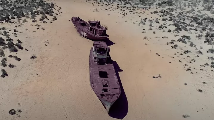 Între anii ’60 şi ’90, principalele râuri care alimentau Marea Aral, Amu Darya și Syr Darya, au fost redirecţionate pentru irigarea a şapte milioane de hectare de bumbac ce aparţineau Uniunii Sovietice. Irigarea masivă şi redirecţionarea râurilor care susţineau cândva lacul au redus semnificativ nivelul său şi, într-un final, acesta s-a împărţit în două. Nivelul ridicat de salinitate din apă a a rămas la un nivel peste cel al oceanului, distrugând vieţi şi prăbuşind ecosistemul local. Nivelul de sare a distrus mijloacele de trai ale oamenilor, iar bărcile folosite de pescari la vremea aceea zac şi acum naufragiate în nisip.