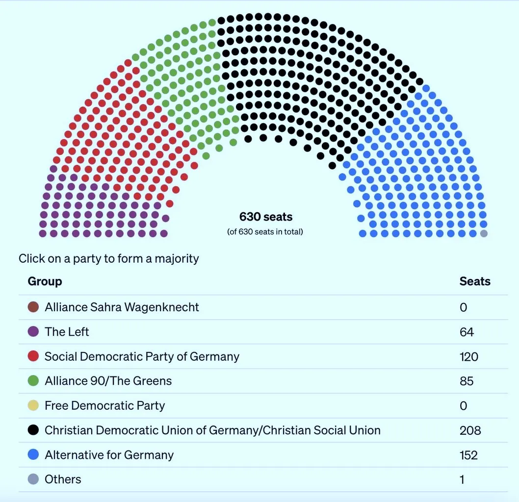 Astfel, CDU/CSU va avea 208 locuri în parlament (aproape o treime), AfD va avea 152, SPD - 120, „Verzii” - 85, iar Partidul Stângii - 64.