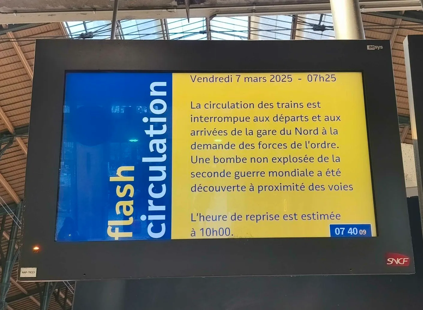 „Din cauza descoperirii aseară a unei bombe neexplodate din al Doilea Război Mondial în timpul lucrărilor efectuate în apropiere de Paris Gare du Nord, traficul este întrerupt spre și dinspre Gare du Nord”, au transmis autoritățile.