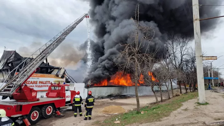 Incendiu de proporții la Bălți. Peste 50 de pompieri luptă de 4 ore pentru a stinge flăcările ce au cuprins un depozit de tip angar, cu suprafața de 350 de metri pătrați. TV8 a surprins fumul negru de la distanță.