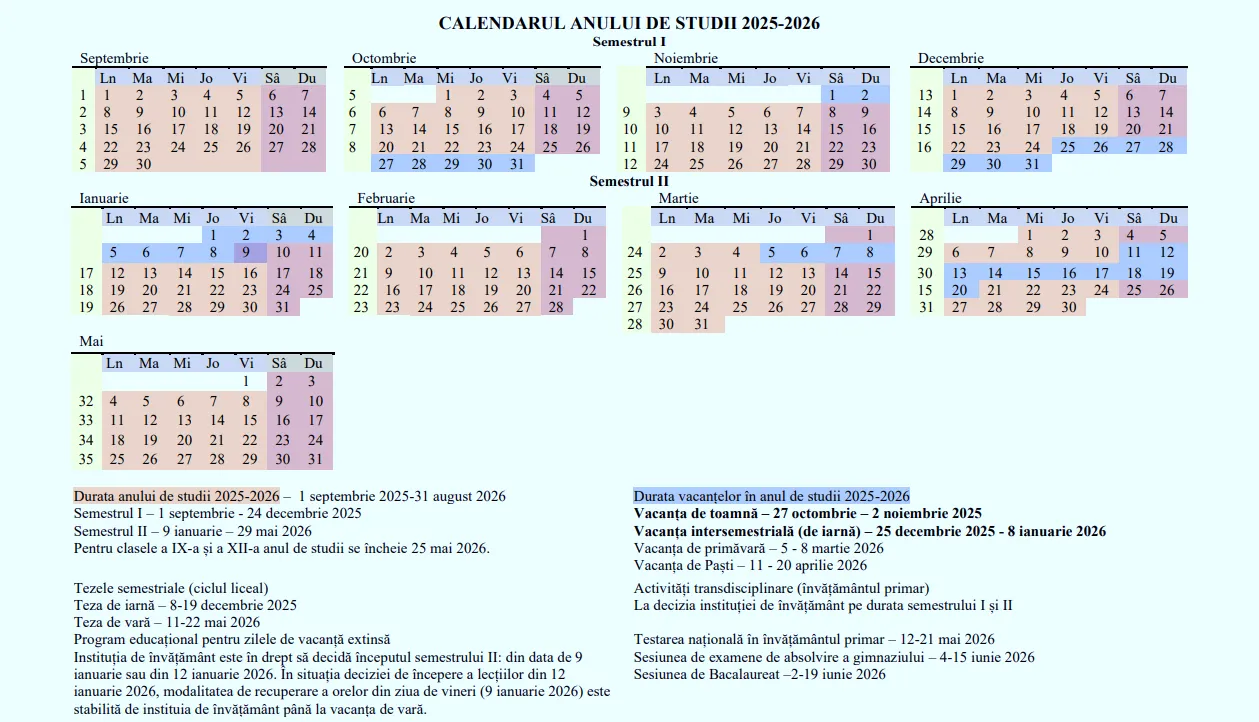 Conform documentului, anului de studii 2025-2026 va începe la 1 septembrie 2025 și se va finaliza 31 august 2026. Acesta va avea următoarea structură: