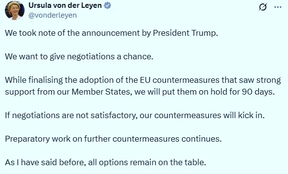 „Am luat act de anunțul președintelui Trump. Dorim să oferim o șansă negocierilor. În ce timp ce finalizăm adoptarea contramăsurilor UE, care au primit un sprijin puternic din partea statelor noastre membre, vom suspenda aplicarea acestora pentru o perioadă de 90 de zile”, a scris pe X oficiala europeană.